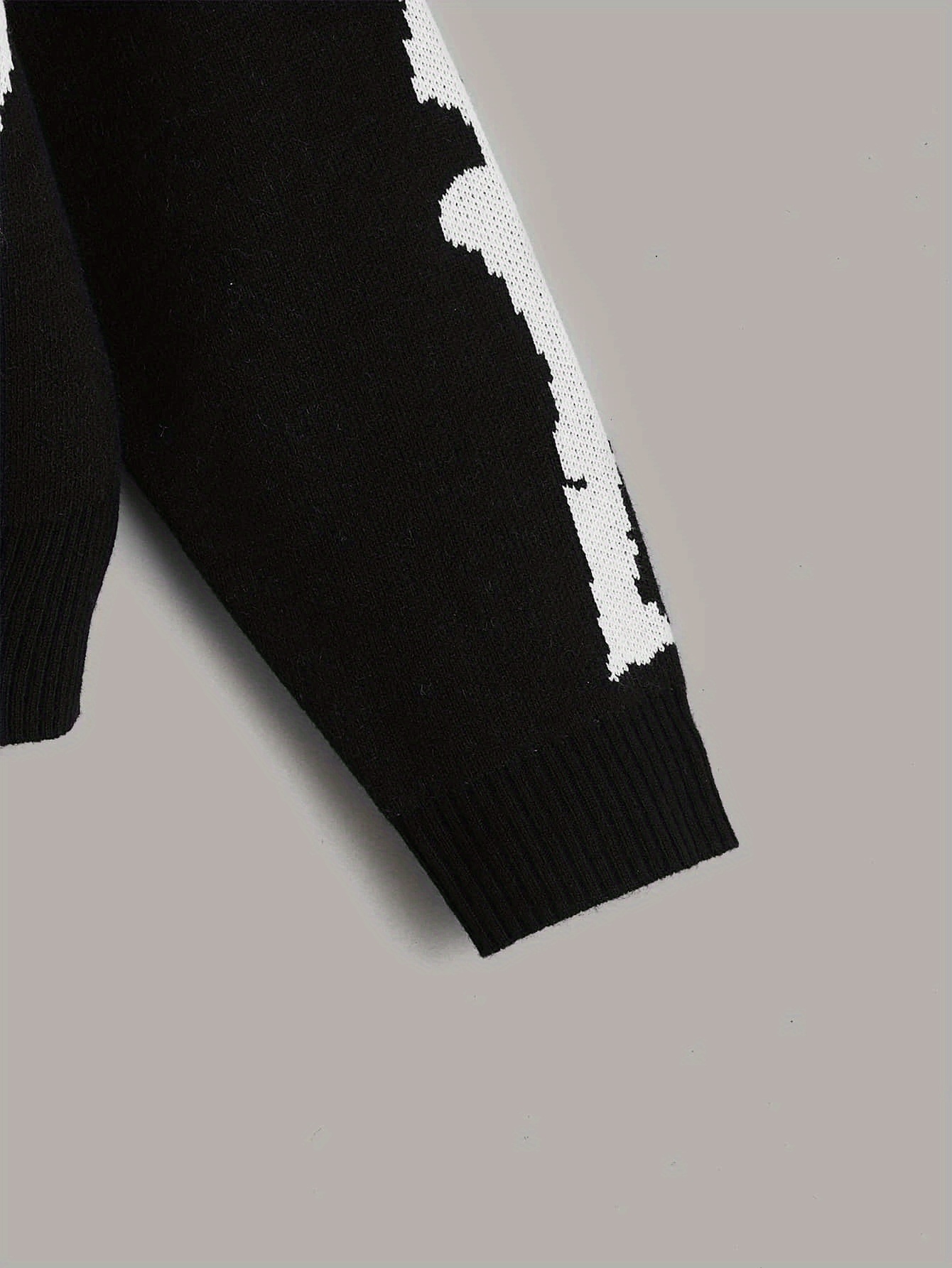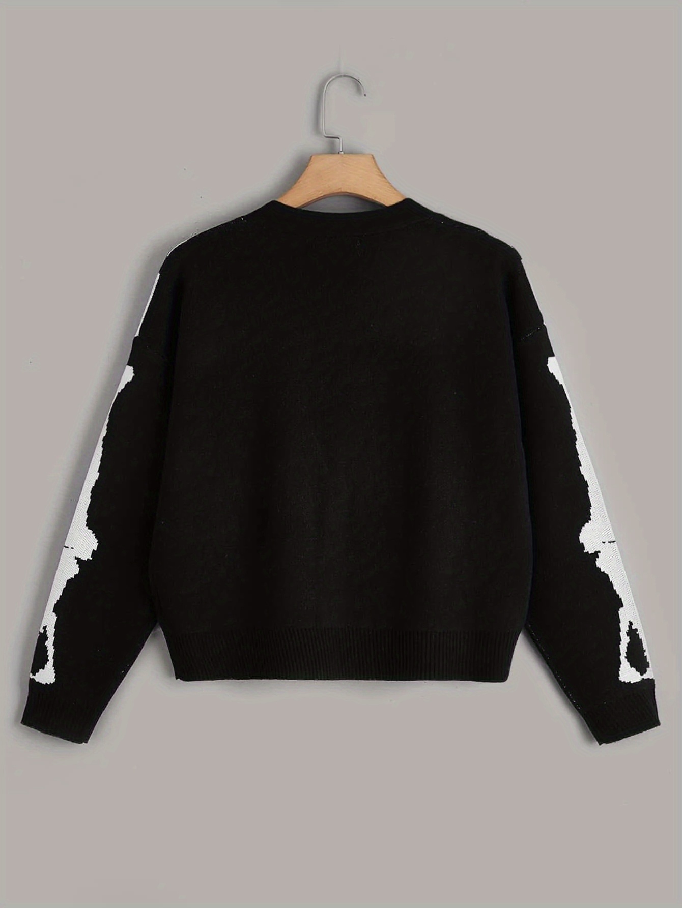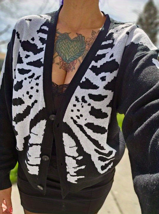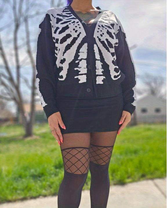 Embrace your spooky side with this cheeky skeleton print knit cardigan. Perfect for layering over your favorite tee, this cozy piece brings a touch of witchy charm to any outfit. The soft knit fabric keeps you warm while the bold skeleton design makes a statement that's equal parts edgy and fun. Whether you're heading to a Halloween party or just want to add some personality to your everyday look, this cardigan delivers comfort without taking itself too seriously. A wardrobe essential for those who love a little mischievous flair.